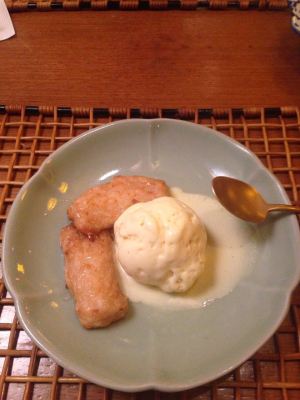 | Banana cozida em leite de coco natural e açúcar de palmeira com sorvete |