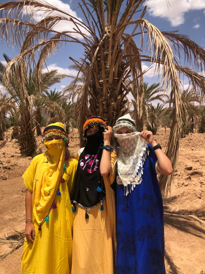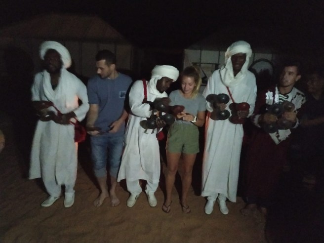 Paramos na cidade de Melaab, onde colocamos roupas típicas e fizemos tatuagem de henna, tudo incluso no tour.