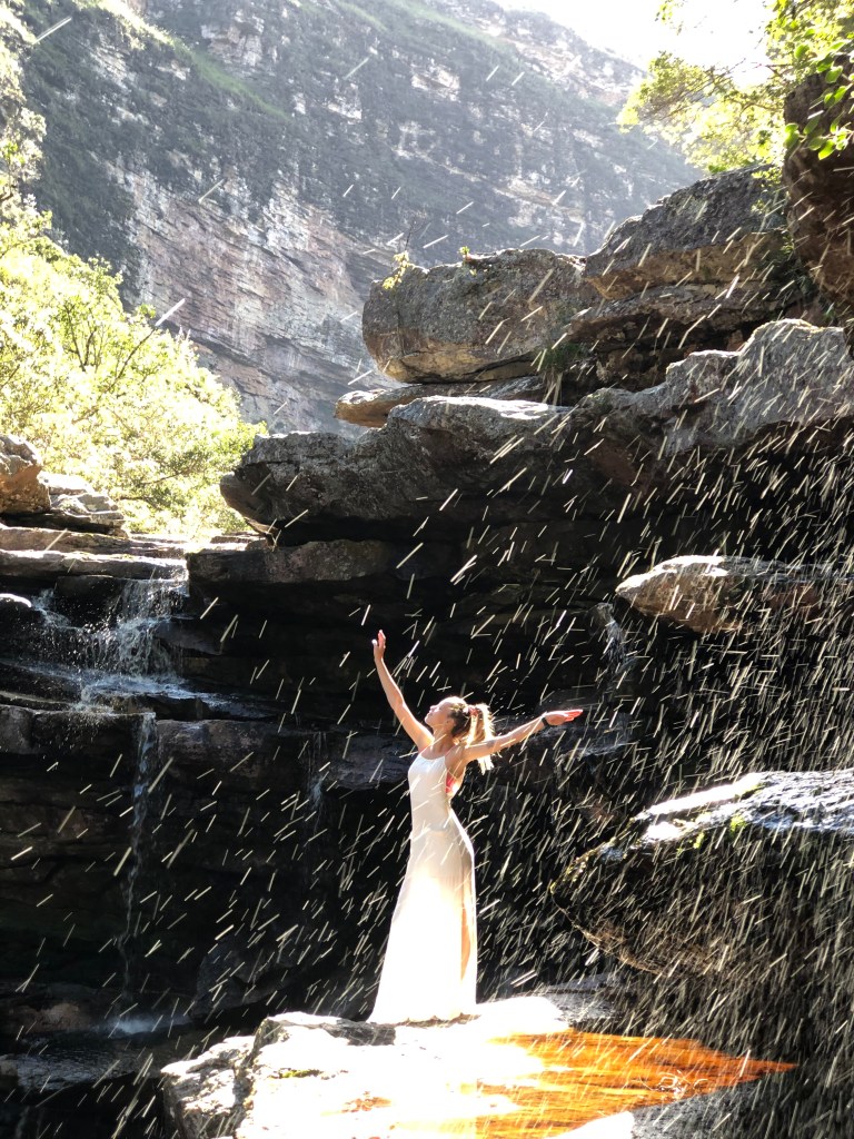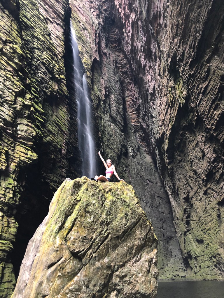 A parte mais difícil é já chegando na cachoeira, pois é necessário segurar firme das pedras, como uma escalada. O guia vai te guiar certinho, onde segurar para não cair. E já na cachoeira, existe a famosa pedra, onde muitos sobem para fazer fotos maravilhosas. A pedra tem em torno de 5 metros de altura. Para subir peça ajuda a um guia, pois ele vai saber onde pisar e segurar.