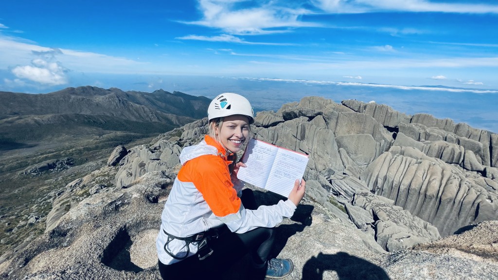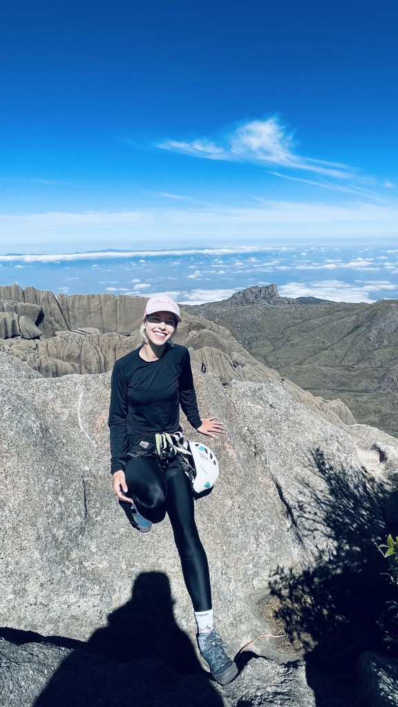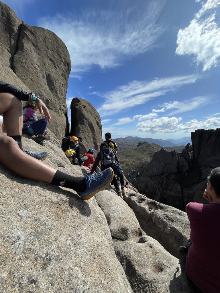 Apesar de tudo isso, a última e “pior” parte ainda estava por vir. No cume há um livro de assinaturas, mas para assinar ele, é preciso descer de rapel até uma pedra-base (foto abaixo), subir de rapel até o outro lado, assinar e voltar. Quando eu vi o percurso, começou a bater uma ansiedade e fiquei super nevosa e com medo. Eu sabia que precisava chegar lá e assinar. Nesse trecho é preciso esperar os grupos que estavam na frente. Durante a espera, apreciamos a vista, comemos e tiramos muitas fotos.